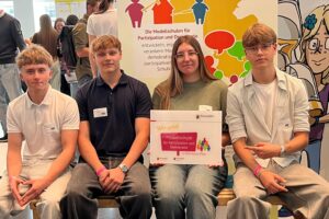 Bildungsminister Sven Teuber übergab den Teams aus Schüler*innen und Lehrkräften ihr neues Schild, über das sie sich sichtlich freuten. Insgesamt sind nun 54 Schulen im Netzwerk miteinander verbunden. Sie alle möchten ihre demokratische Schulkultur weiterentwickelt, sich austauschen und voneinander lernen.